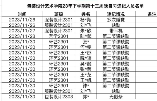 为促进我院优秀学风建设,提高学习热情,推动主动学习,加强对学生思想政治教育的引导,促进学生向优向上发展。现公布2023-2024学年第一学期第十三周课堂学风建设情况登记表。